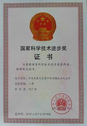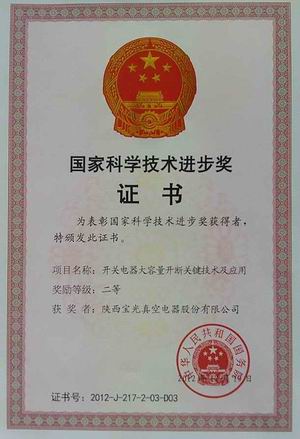 2013年1月18日,在國家科學技術大會上,由西安交通大學、陜西寶光真空電器股份有限公司、常熟開關制造有限公司、河南平高電器股份有限公司共同完成的《開關電器大容量開斷關鍵技術及應用》項目獲得2012年度國家科學技術進步獎二等獎,西安交通大學賈申利教授代表項目組到北京參加會議,并領取了國務院頒發(fā)的獲獎證書。