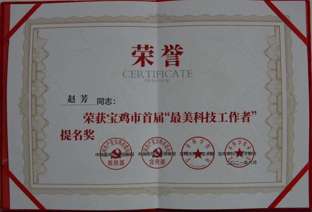 近日,寶光股份趙芳在中共寶雞市委組織部、中共寶雞市委宣傳部、寶雞市科學(xué)技術(shù)局、寶雞市科學(xué)技術(shù)協(xié)會(huì)聯(lián)合開展的“尋找寶雞最美科技工作者”評(píng)比活動(dòng)中,被授予2021年“優(yōu)秀科技工作者”提名獎(jiǎng)。