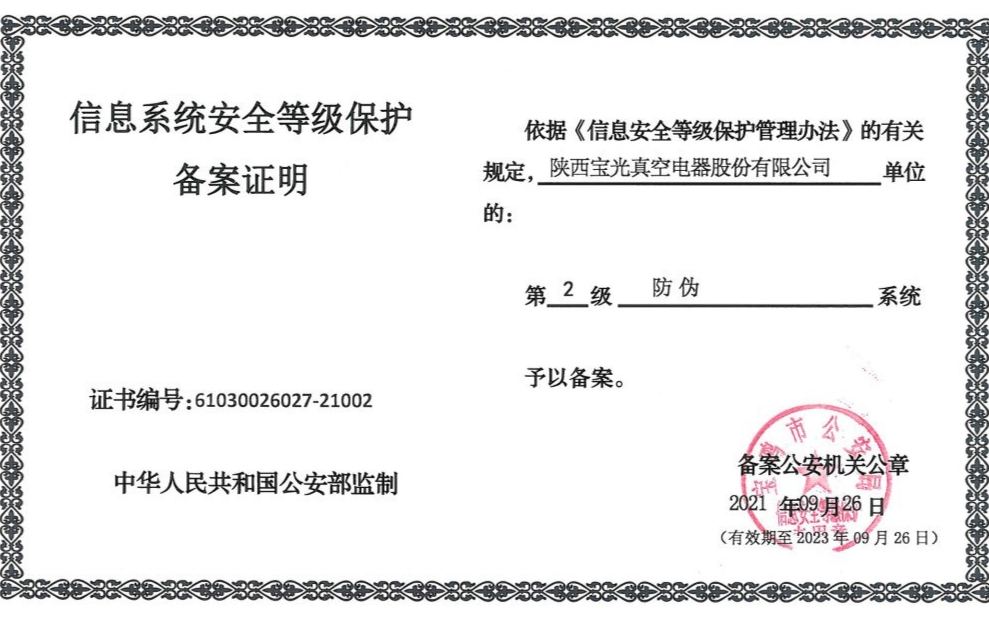9月26日,寶光股份順利取得由寶雞市公安局下發(fā)的三份信息系統(tǒng)安全等級保護(hù)備案證明,該證明分別對公司第2級ERP系統(tǒng)、防偽系統(tǒng)、官方網(wǎng)站系統(tǒng),予以備案。