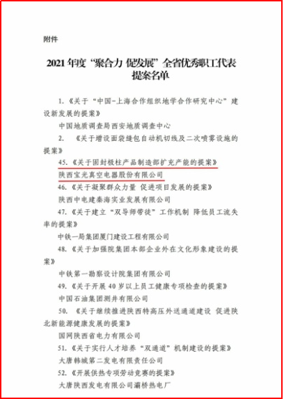 近日,從陜西省總工會傳來喜訊,寶光集團(tuán)《關(guān)于固封極柱產(chǎn)品制造部擴(kuò)充產(chǎn)能的提案》榮獲陜西省2021年度“聚合力 促發(fā)展”全省優(yōu)秀職工代表提案。
