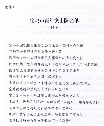近日,從團(tuán)市委獲悉,寶光股份固封班組被授予“寶雞市青年突擊隊(duì)”榮譽(yù)稱號(hào)。