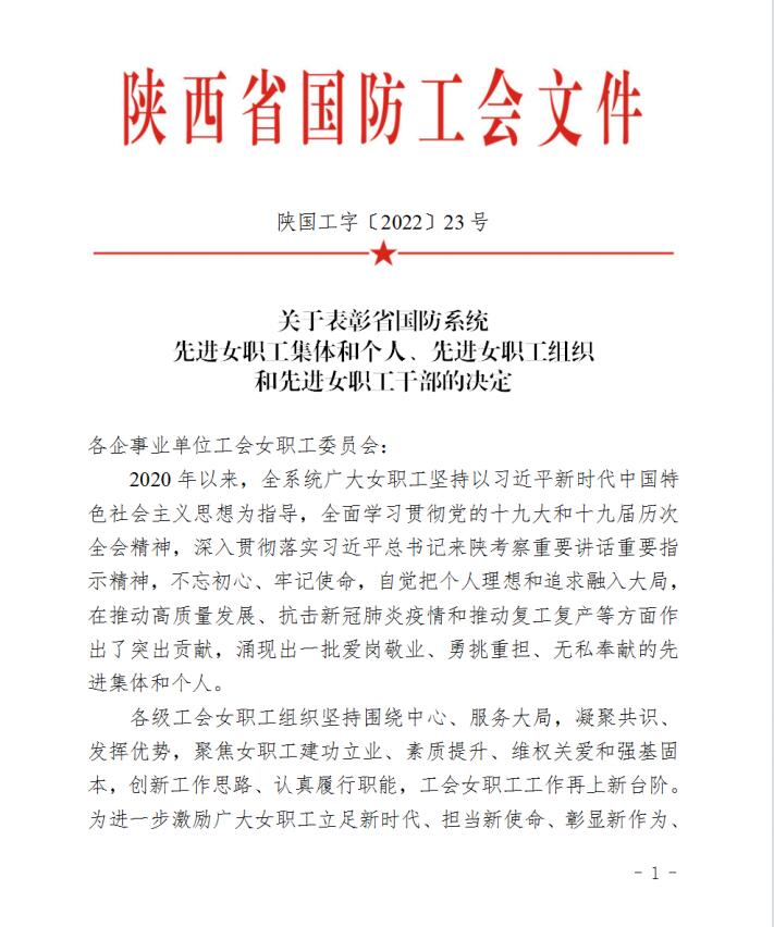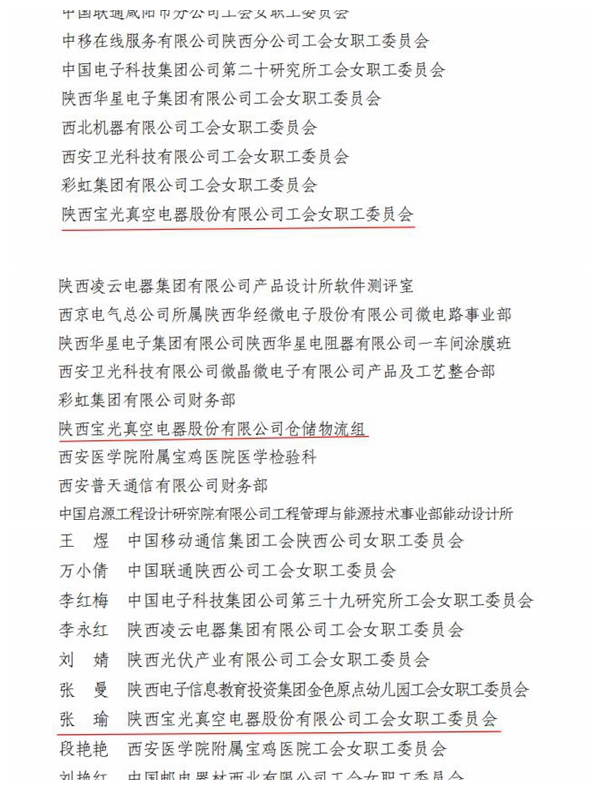 近日,從陜西省國防工會傳來喜訊,陜西寶光真空電器股份有限公司工會委員會女職工委員會被授予“陜西省國防工會先進女職工委員會”榮譽稱號,生產(chǎn)管理處倉儲物流組被授予“陜西省國防科技工業(yè)五一巾幗標兵崗”,工會辦公室張瑜同志被評為“陜西省國防工會先進女職工干部”榮譽稱號。