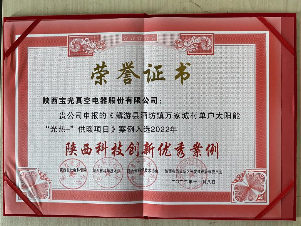 近日,陜西省社會科學(xué)院、陜西省科學(xué)技術(shù)廳、陜西省科學(xué)技術(shù)協(xié)會、陜西省西咸新區(qū)開發(fā)建設(shè)管理委員會聯(lián)合發(fā)布“2022年陜西科技創(chuàng)新優(yōu)秀案例”,寶光股份申報(bào)的《麟游縣酒坊鎮(zhèn)萬家城村單戶太陽能“光熱+”供暖項(xiàng)目》成功獲選高效治理高品質(zhì)生活組“陜西科技創(chuàng)新優(yōu)秀案例”。