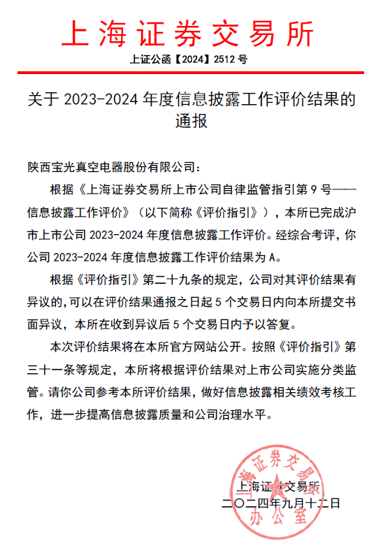 日前,上海證券交易所(以下簡(jiǎn)稱“上交所”)發(fā)布了《滬市上市公司2023至2024年度信息披露工作評(píng)價(jià)結(jié)果》,寶光股份(600379)榮獲信息披露工作最高考核評(píng)級(jí)A級(jí),這是公司首次獲此榮譽(yù),是上交所對(duì)寶光股份信息披露、公司治理、投資者關(guān)系管理、履行社會(huì)責(zé)任等方面的高度認(rèn)可和肯定。