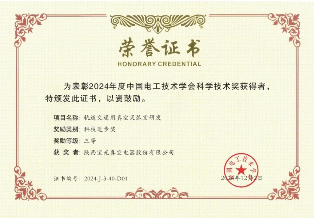 項(xiàng)目名稱:軌道交通用真空滅弧室研發(fā)。項(xiàng)目簡(jiǎn)介:本項(xiàng)目研發(fā)出的BGH2570、BGH2580、BGH2590/R、BGH2530等系列化產(chǎn)品,可替代進(jìn)口產(chǎn)品。4種產(chǎn)品全部通過了裝車運(yùn)行驗(yàn)證,部分產(chǎn)品實(shí)現(xiàn)了小批量供貨。其中BGH2570型產(chǎn)品于2023年9月通過了中國機(jī)械工業(yè)聯(lián)合會(huì)產(chǎn)品鑒定,技術(shù)水平達(dá)到國際領(lǐng)先。2021年至2024年累計(jì)銷量超過1000只,累計(jì)銷售額超過超過600萬元。