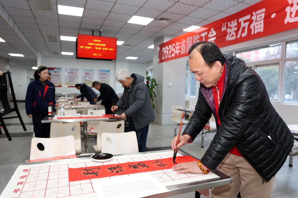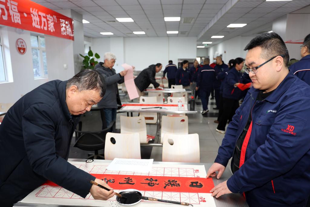 在送春聯(lián)現(xiàn)場(chǎng),書法家們揮毫潑墨、筆走龍蛇,聞?dòng)嵍鴣淼穆毠ぜ娂妵跁琅云诖善贰R煌R活D、一起一落,一句句散發(fā)著清新墨香的吉祥語句躍然紙上,“一元二氣三陽泰,四時(shí)五福六合春”“春滿乾坤千里秀,時(shí)逢盛世萬家興”,一副副滿載美好祝福的春聯(lián)和“?!弊周S然紙上,既有辭舊迎新的熱切祈盼,也有對(duì)幸福生活的美好祝福。職工們拿到寫滿祝福和美好祝愿的春聯(lián),喜悅之情溢于言表?;顒?dòng)期間共送出春聯(lián)近400余幅,福字300余幅。