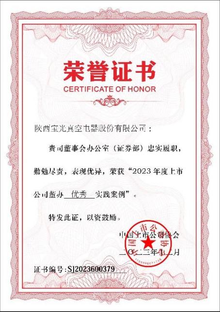 自寶光股份上市以來,董事會與管理層高度重視各項工作,董辦團隊切實關(guān)注各項履職能力提升,堅守初心,嚴格按照法律法規(guī)開展各項工作。獲得此項榮譽充分體現(xiàn)了中國上市公司協(xié)會對寶光股份董事會辦公室信息披露管理、治理機制建設、投資者關(guān)系管理、相關(guān)制度制定修訂、ESG管理披露、監(jiān)督培訓等各項工作成果的高度認可和充分肯定。