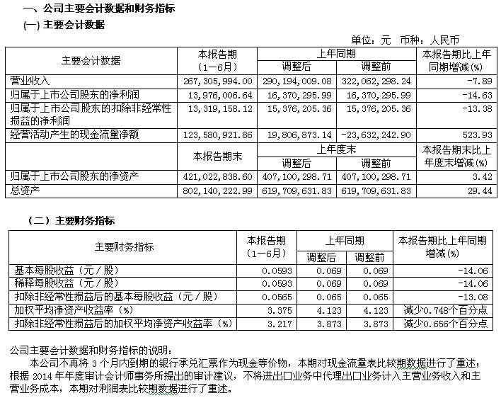 寶光股份2015年半年度主要財(cái)務(wù)指標(biāo)